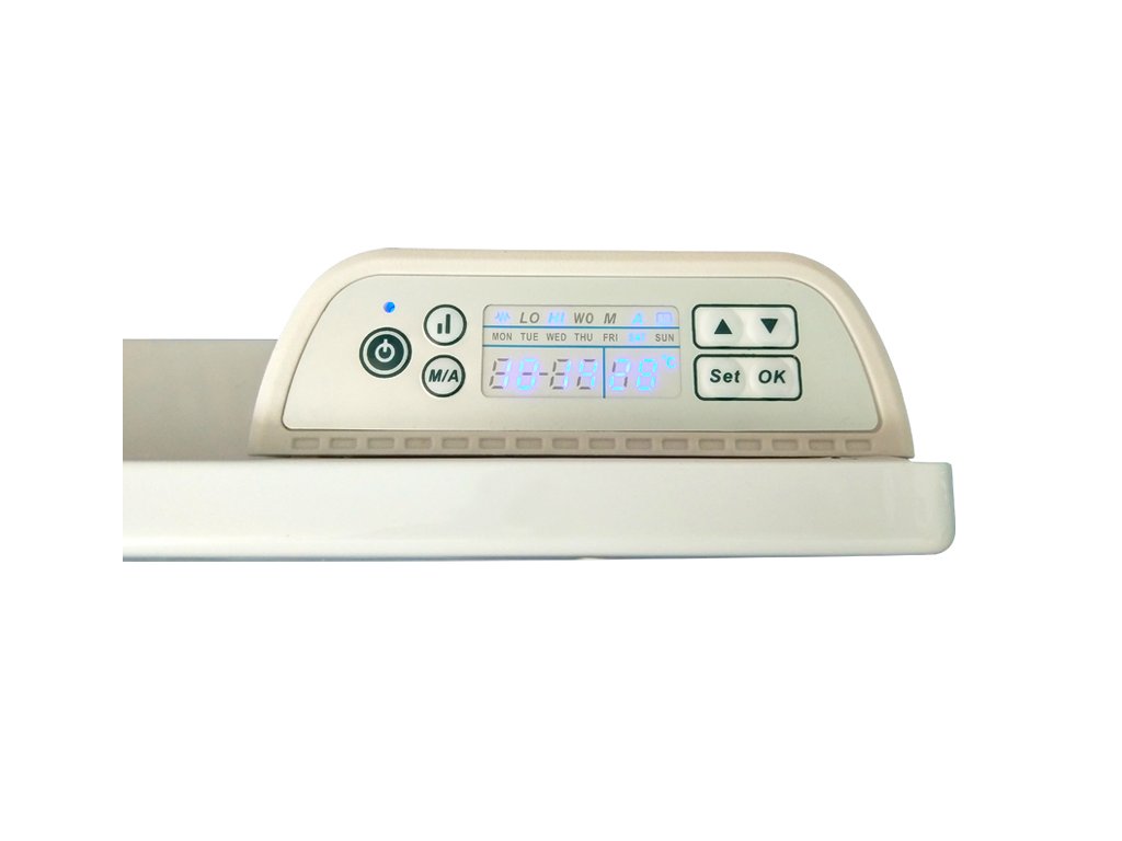 Elektronické ovládanie s LED displejom umiestnené v hornej časti umožňuje nastaviť a používať konvektor v manuálnom režime, alebo v automatickom režime s týždňovým programom. V oboch režimoch si nastavíte požadovanú teplotu, ktorú bude konvektor v miestnosti automaticky udržiavať na zvolenej hodnote v rozsahu 5-45 °C. V režime s týždňovým programom je možnosť nastaviť až štyri rôzne časové úseky ohrevu na každý deň v týždni, počas ktorých bude konvektor vykurovať podľa zvolenej teploty. Elektronika je vybavená aj funkciou detskej poistky, ktorej aktiváciou zablokujte tlačidlá na ovládacom paneli. Displej po dokončení nastavenia a pri nečinnosti stmavne.